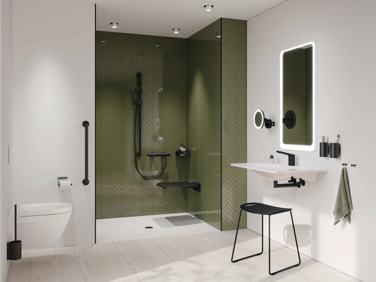 Mit einem umfänglichen Portfolio an Sanitär- und Beschlaglösungen in Schwarz matt bietet HEWI eine durchgehende Gestaltung – von der Tür bis ins Bad.
