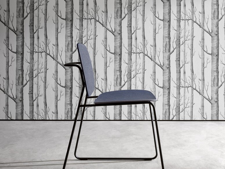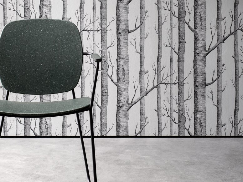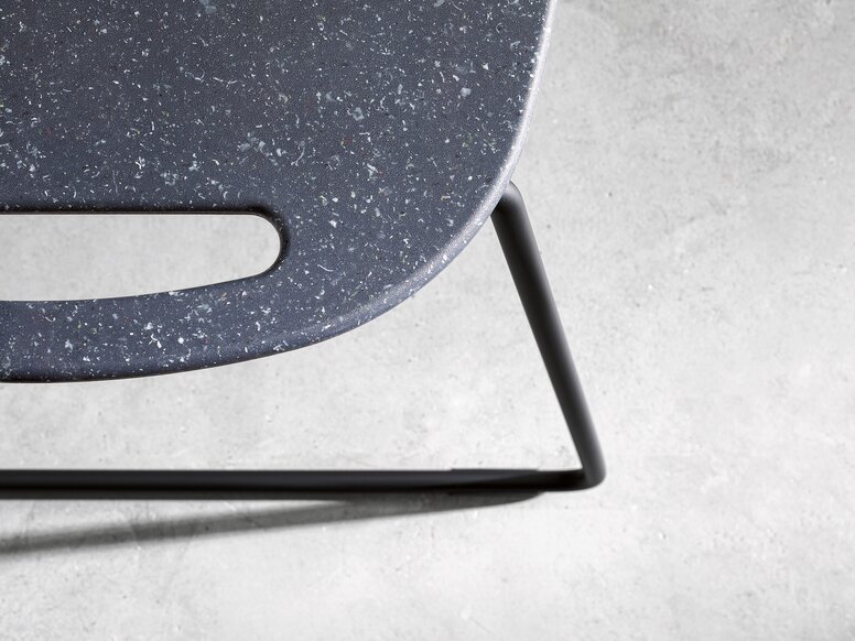 The material blend of recycled polypropylene and recycled polyamide gives the lightly speckled surfaces a vibrant and individual look with their unique patterns and translucent spots of colour. The use of recycled material not only reduces plastic waste, but also makes each seat and armrest a one-off.