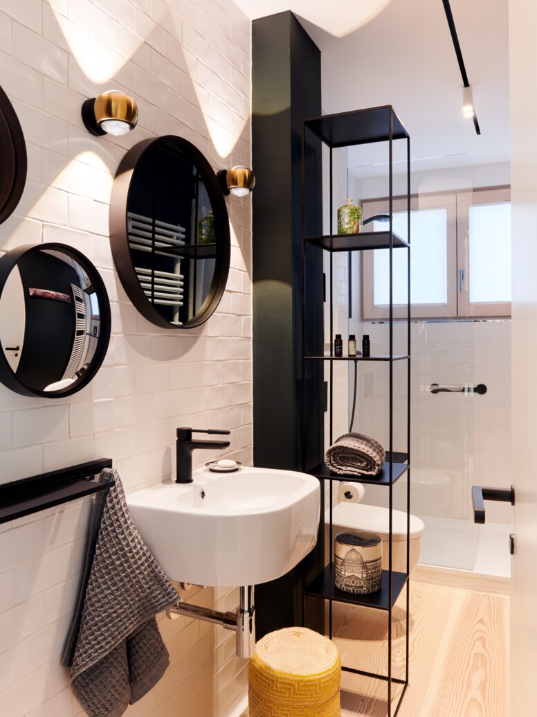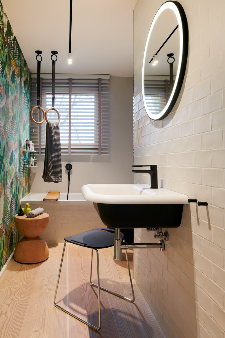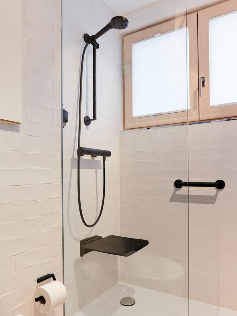 Le réaménagement de l'appartement a été basé sur le concept de conception universelle. Les salles de bains ont été équipées de carreaux italiens Metro, d'une baignoire et d'une douche de Kaldewei ainsi que d'accessoires et de produits de confort de la ligne design System 900 en noir mat de HEWI.